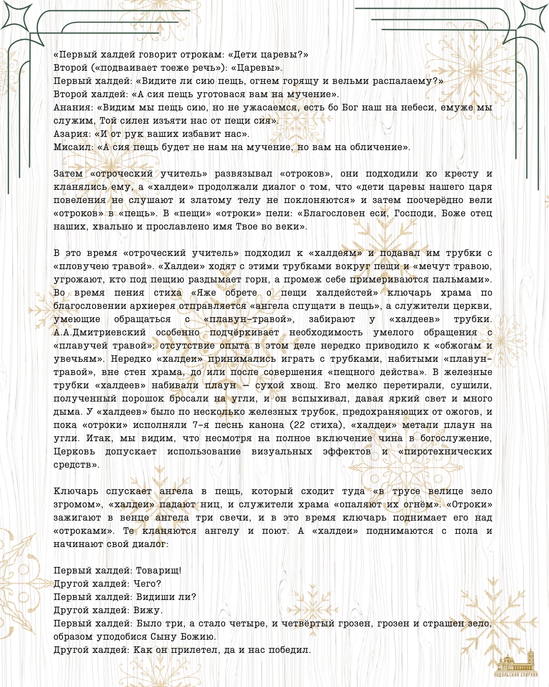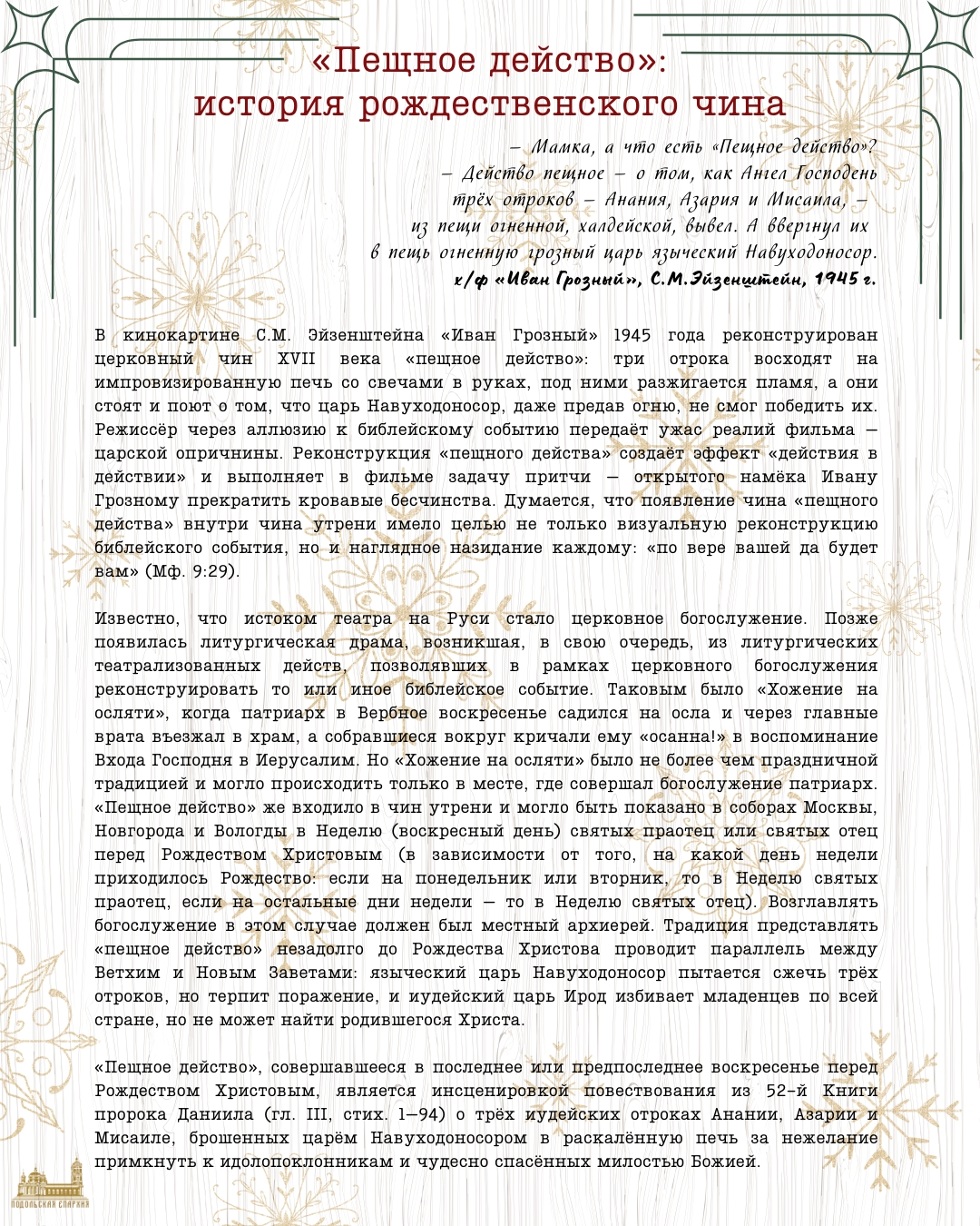 Память пророка Даниила и отроков Анании, Азарии и МисаилаСегодня, 30 декабря, Церковь совершает память пророка Даниила и отроков Анании, Азарии и Мисаила. История трёх знатных юношей, отказавшихся поклониться языческой статуе, воздвигнутой вавилонским царём Навуходоносором, легла в основу церковного театрализованного чина «пещное действо», исполнявшегося раз в год накануне Рождества Христова. События этого чина происходили за 600 лет до пришествия в мир Христа Спасителя, но имели тесную связь с Рождеством. В зависимости от того, на какой день недели приходился праздник, «пещное действо» исполнялось на утрене в Неделю святых праотец (если Рождество было в понедельник или вторник) или в Неделю святых отец (в другие дни недели), то есть за одну или две недели до Рождества. О том, как совершалось «пещное действо» и что оно символизировало, сегодня в своей статье рассказывает редактор информационных ресурсов Подольской епархии, выпускница театроведческого факультета Российского театрального института – ГИТИС Анастасия Блинова. ![]() ![]() ![]() ![]() ![]() Расписание Богослуженийхрам Всех святых в земле Русской просиявших г. Ступинохрам Всех святых в земле Русской просиявших ( храмовое поле) храм вмч. Пантелеимона (больничный храм) храм Новомучеников Ступинских Объявления