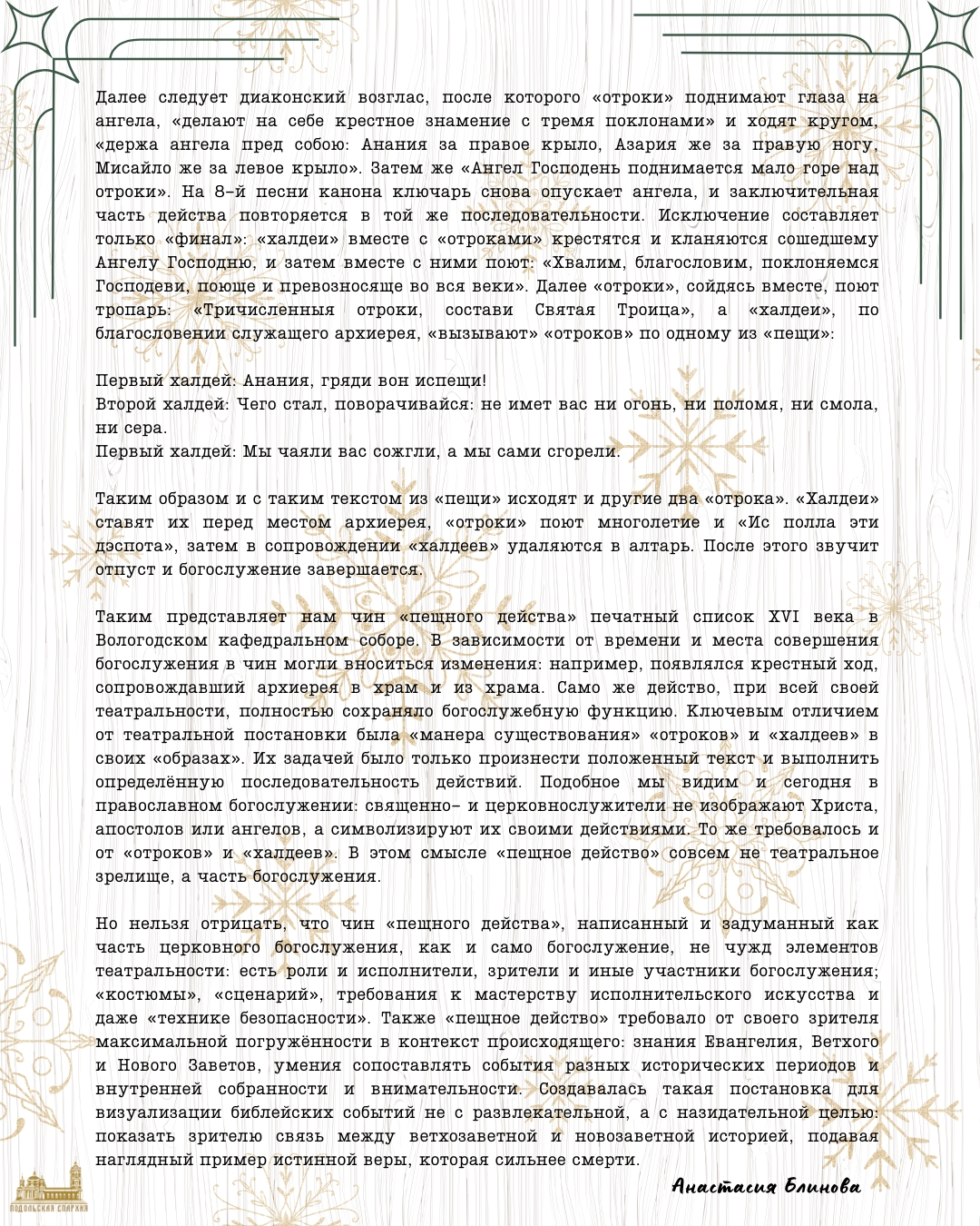 Память пророка Даниила и отроков Анании, Азарии и МисаилаСегодня, 30 декабря, Церковь совершает память пророка Даниила и отроков Анании, Азарии и Мисаила. История трёх знатных юношей, отказавшихся поклониться языческой статуе, воздвигнутой вавилонским царём Навуходоносором, легла в основу церковного театрализованного чина «пещное действо», исполнявшегося раз в год накануне Рождества Христова. События этого чина происходили за 600 лет до пришествия в мир Христа Спасителя, но имели тесную связь с Рождеством. В зависимости от того, на какой день недели приходился праздник, «пещное действо» исполнялось на утрене в Неделю святых праотец (если Рождество было в понедельник или вторник) или в Неделю святых отец (в другие дни недели), то есть за одну или две недели до Рождества. О том, как совершалось «пещное действо» и что оно символизировало, сегодня в своей статье рассказывает редактор информационных ресурсов Подольской епархии, выпускница театроведческого факультета Российского театрального института – ГИТИС Анастасия Блинова. ![]() ![]() ![]() ![]() ![]() |