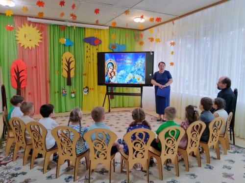 7 ноября, в рамках проекта Подольской епархии «Добрый сад», в МБОУ СОШ №2 (дошкольное отделение) старшей группе №5 "Березонька" прошло занятие, посвящённое празднованию Казанской иконы Божией Матери и Дню народного единства. На занятии присутствовал настоятель Тихвинского храма города Ступино иерей Георгий Шмарин. Воспитатель группы Гавриленко Л.Н. и музыкальный руководитель Карнюшина О.Е. в доступной форме рассказали ребятам об истории образа Пресвятой Богородицы и как эта икона помогла нашему народу объединиться в смутное время.